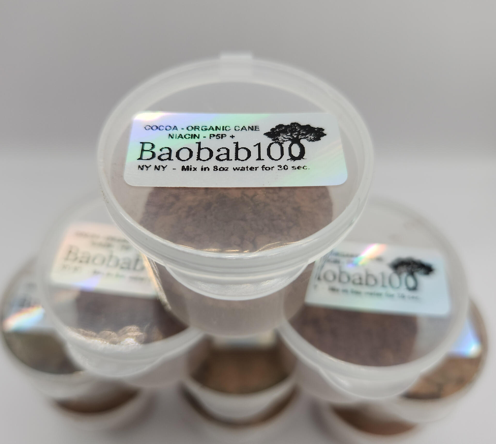 Baobab100 is an organic drink mix, combining niacin, cocoa, P5P, organic cane, and other essential nutrients, designed to provide comprehensive bodily support for enhanced longevity and active living beyond 100 years.